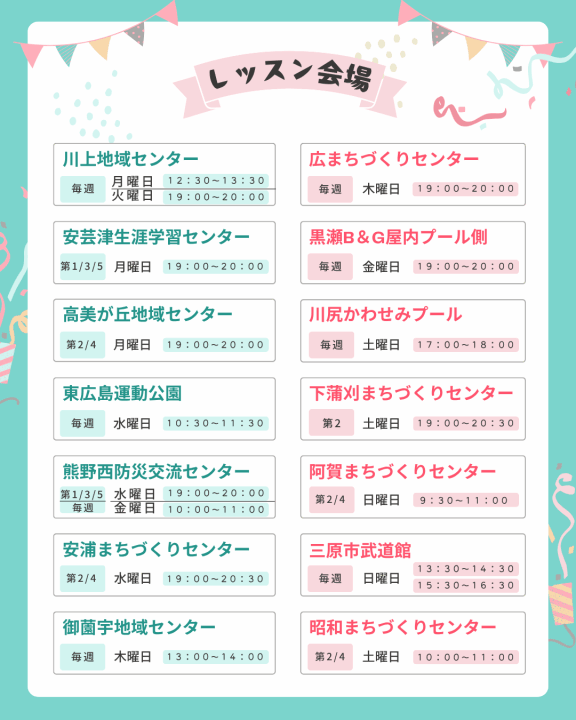 | 2022.06.28 | 【新講座情報】東広島運動公園教室受付スタート! 開催日:毎週水曜日10時30分より |
